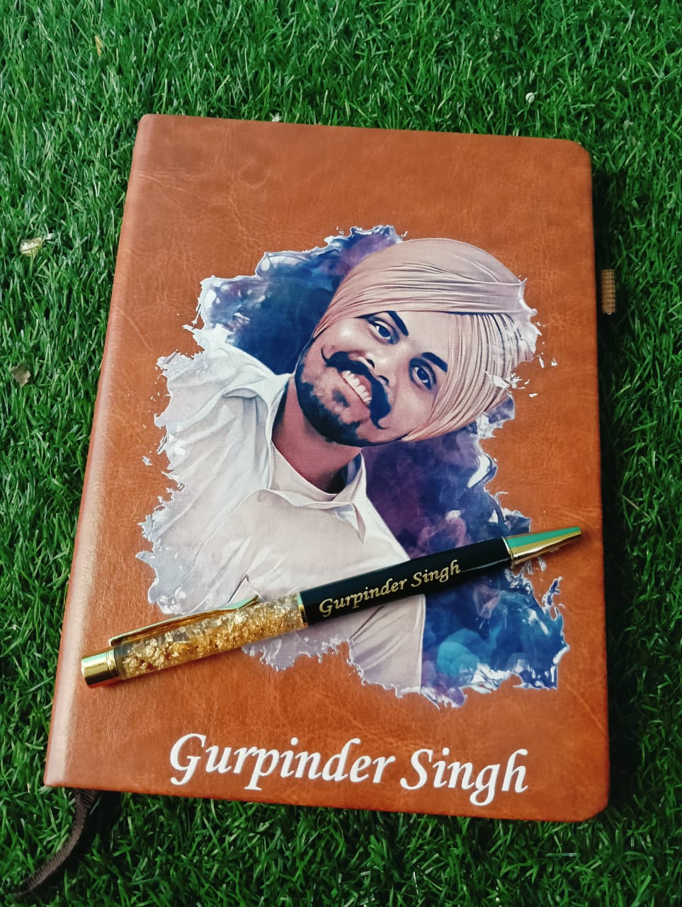 Premium 8×10 inch diary with your photo, name, and charm number printed on the cover — plus a stylish golden flake pen with your name engraved.